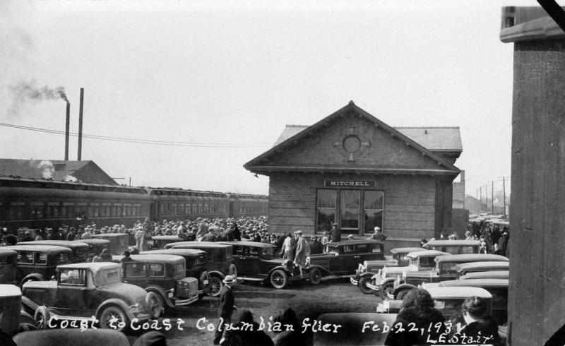 The people of Mitchell greet the Columbian Flyer train on its first trip through Mitchell on February 22, 1931, after a rerouting of its route by the Milwaukee Road. The train had been in service since 1911, when the Milwaukee Road had finished its expansion to the Pacific Coast. Before the rerouting, the flyers route was from Chicago to the Twin Cities and then west into Aberdeen. The Columbian Flyer had both sleeping and dining cars.