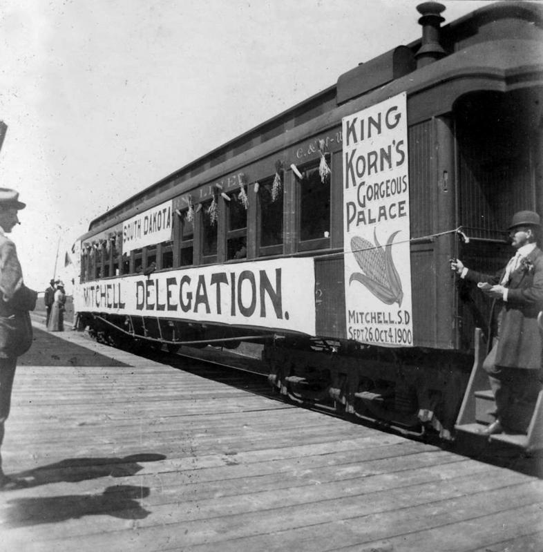 This Delegation Train Car was how the politicians came to Mitchell to do their campaigning in 1900. Each political party would have their own train car for their candidates. In1900, the parties held huge rallies during Corn Palace Exposition with thousands of people attending. William McKinnley was running for President of the United States along with Theodore Roosevelt for Vice President. Democratic candidates were William J. Bryan for president and Adlai Stevenson for Vice President. McKinnley won but died while in office leaving Roosevelt to become President.