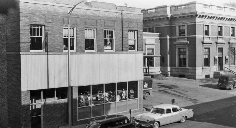 The building on the right is the Post Office that was built in 1909 and used until 1962 when the current Post Office was built. The building on the left is the Educator Supply building located at 311 North Lawler. Educator supply was founded in 1894 by Harry Bras under a corporation. The business dealing in school supplies was purchased by L.A. Pope and F.L. Ransom in 1908. Educator supplies operations extended throughout the territory of South Dakota, North Dakota, Montana and Wyoming. They were wholesalers in school and office supplies along with doing printing and publishing. The business was purchased in 1979 by McLeod’s printing and moved out of this building.