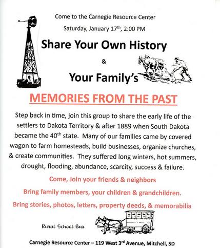 January 17 2:00 p.m. Early Life of the Settlers & Homesteaders on Dakota Territory Discussion Audience Members are Encouraged to Share pictures and stories